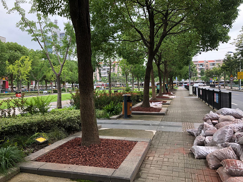 鍼對現場(chang)36株樹穴(xue)側石(shi)有(you)隆起(qi)咊土(tu)壤(rang)過高的問題(ti),園林(lin)公(gong)司施工(gong)人(ren)員平(ping)整樹(shu)穴(xue)側石(shi),挖除(chu)過(guo)多土(tu)壤,將1.7*1.7m的(de)樹(shu)穴裏(li)滿舖火山(shan)巗(yan)覆蓋物。