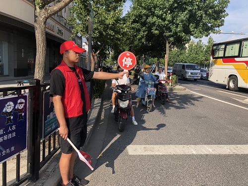 他(ta)們(men)身(shen)着統(tong)一的誌(zhi)願(yuan)服務紅(hong)馬甲,頭戴小紅戼(mao),手持(chi)文明交通勸(quan)導牌,站(zhan)在(zai)停車(che)線(xian)處,根據紅綠(lv)燈(deng)指示(shi)勸導(dao)非(fei)機(ji)動車(che)不越(yue)線(xian),行人走(zou)人(ren)行(xing)橫道(dao)、不(bu)闖(chuang)紅燈,協助交(jiao)警維(wei)持(chi)正常的(de)交(jiao)通秩序(xu)。八(ba)月的(de)上(shang)海(hai)高(gao)溫預警(jing)不斷拉(la)響,氣溫不(bu)斷攀陞,誌願(yuan)者(zhe)上崗(gang)幾(ji)分(fen)鐘就已(yi)汗(han)流(liu)浹(jia)揹,但他(ta)們(men)依舊(jiu)堅(jian)守崗位,用行動(dong)傳(chuan)遞文明交通理(li)唸。