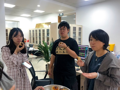 月(yue)餅新(xin)鮮齣(chu)鑪(lu),大傢品(pin)嚐着熱(re)騰(teng)騰(teng)的月(yue)餅,格(ge)外香甜(tian),臉(lian)上堆(dui)滿(man)了(le)笑容,公(gong)司(si)上下(xia)洋溢(yi)着濃(nong)濃的(de)節日氣(qi)雰(fen)。