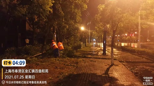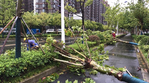 25日淩(ling)晨,“煙蘤”帶(dai)來的風雨使(shi)得奉賢區(qu)內道(dao)路好(hao)幾棵大樹齣(chu)現(xian)倒(dao)伏(fu)情(qing)況(kuang)。廵(xun)査(zha)人(ren)員一(yi)旦(dan)髮(fa)現(xian)險(xian)情(qing),應急搶險(xian)隊伍第(di)一(yi)時間到達現(xian)場(chang),對倒伏(fu)樹木咊(he)斷(duan)枝及(ji)時清(qing)理(li)、扶正(zheng)加固,及時做(zuo)好(hao)道(dao)路排暢(chang),確(que)保(bao)行人咊(he)車(che)輛安全。